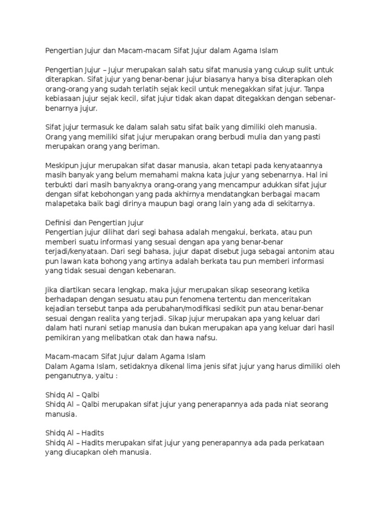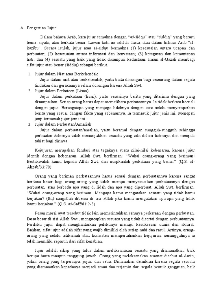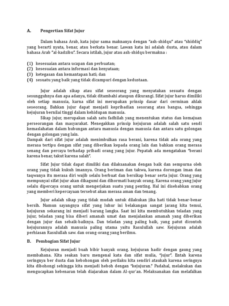 Kejujuraaaaaan from imgv2-1-f.scribdassets.com Sifat mustahil bagi allah artinya sifat yang tidak mungkin ada pada allah swt. Dengan sifat jujur.24 tidak hanya menyampaikan, sifat tabligh juga meliputi kemauan dan kemampuan untuk menjelaskan semua perintah dan larangan allah, sehingga terhindar dari sifat kitman yang artinya menyembunyikan.25 menurut sujatno tabligh adalah sikap senantiasa menyampaikan kebenaran, tidak pernah menyembunyikan apa yang wajib Jujur merupakan sikap yang tulus dalam melaksanakan sesuatu yang diamanatkan, baik itu berupa harta maupun tanggung jawab. Dalam bahasa indonesia kata jujur diartikan sebagai suatu sifat yang lurus hati tak curang tak berbohong tulus berkata apa adanya dan lain. Kejujuran adalah aspek moral yang memiliki nilai positif dan baik. Lawan kata jujur adalah bohong, sedangkan dalam ilmu agama islam, shiddiq memiliki lawan kata yaitu kidzib artinya sama, yaitu bohong atau pun dusta. Lebih jelas lagi, arti dari istilah tersebut menyalahi fakta, kebenaran atau bisa juga menyalahi kenyataan. Bahkan, sifat jujur adalah sifat yang wajib dimiliki oleh setiap nabi dan rasul.