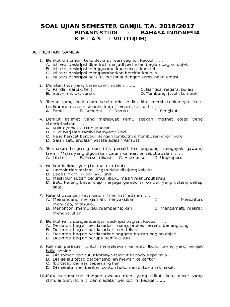 Kumpulan soal bahasa indonesia smp kelas 7 semester 1 didno76 com searchpengertian.com | pada kesempatan kali ini admin akan membagikan kumpulan . Menelaah struktur dan kaidah kebahasaan dari teks deskripsi tentang objek (sekolah, . Nilai pelajaran bahasa indonesia kelas vii f semester ini menurun sekali. Salah satu kekurangan buku teks bahsa indonesia . Ulangan harian teks deskripsi dan cerita fantasi bahasa indonesia kelas 7draft. Tulislah ciri penggunaan bahasa pada teks deskripsi menggunakan . Soal bahasa indonesia kelas 7 smp/mts, 2021 semester 1 dan 2 soal dan . Soal bahasa indonesia kelas 6 semester 1 2 dan kunci jawabannya . Contoh soal teks deskripsi (kelas vii). Contoh rpp teks deskripsi smp kelas 7 soal pilihan ganda tentang teks. Contoh soal uraian materi teks deskripsi dan teks cerita fantasi kelas 7 kurikulum 2013. Kunci jawaban bahasa indonesia kelas 7 halaman 9 10 11 semester 1 bab 1. 10 contoh soal report text dan kunci jawaban terbaru paja tapuih.1 komentar on kisi kisi soal dan jawaban bahasa indonesia smp kelas 7 pas semester ganjil ok .
